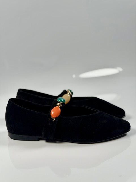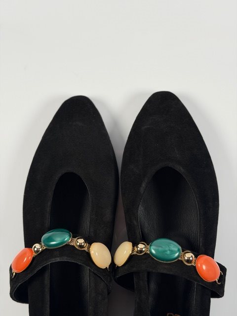 Mary-Jane ballerina i mocka med skinnfoder, gummisula och ett dekorativt band med guld och stenar.